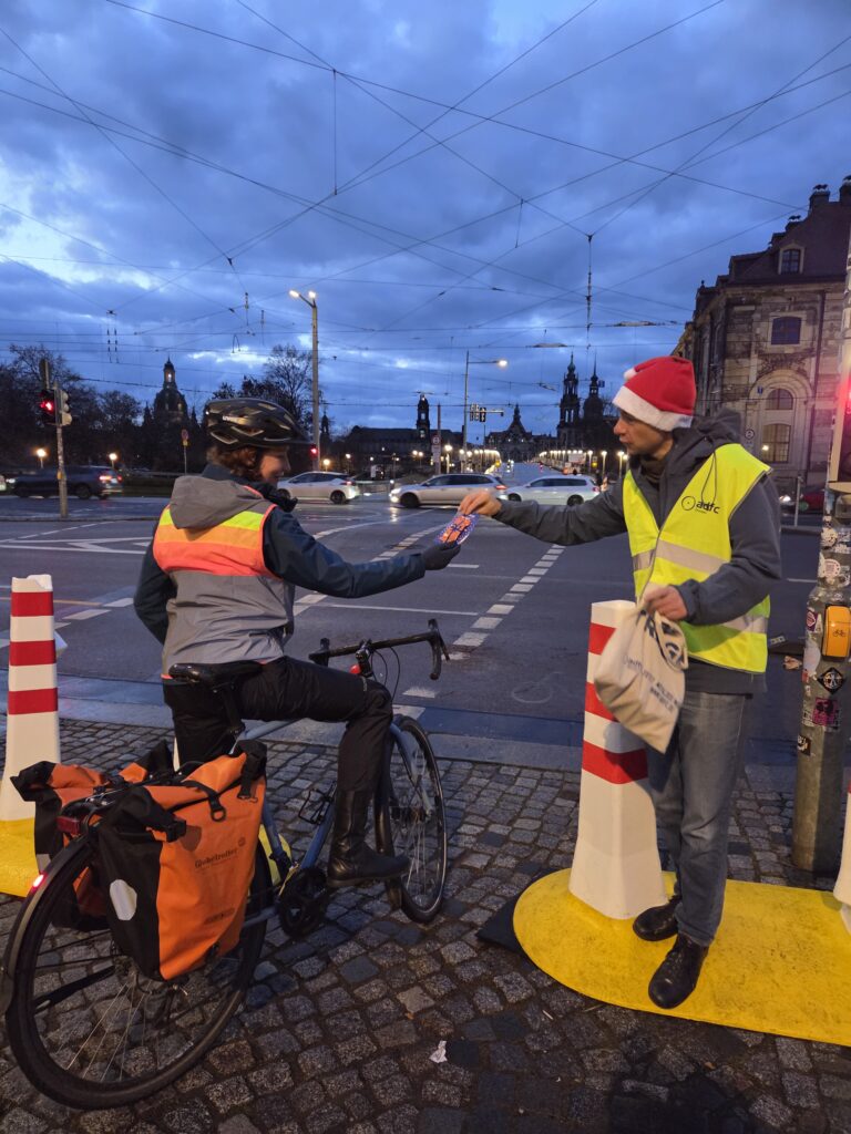 Schon seit 2012 überrascht der ADFC Dresden am Nikolausmorgen die Dresdner Radfahrerinnen und Radfahrer mit einem kleinen süßen Geschenk. Weil der Nikolaustag in diesem Jahr auf ein Wochenende fiel, hat der ADFC Dresden seine traditionelle Nikolausaktion auf den heutigen Montag verlegt. In den frühen Morgenstunden standen engagierte ADFC-Mitglieder an mehreren zentralen Punkten der Stadt. Sie […]