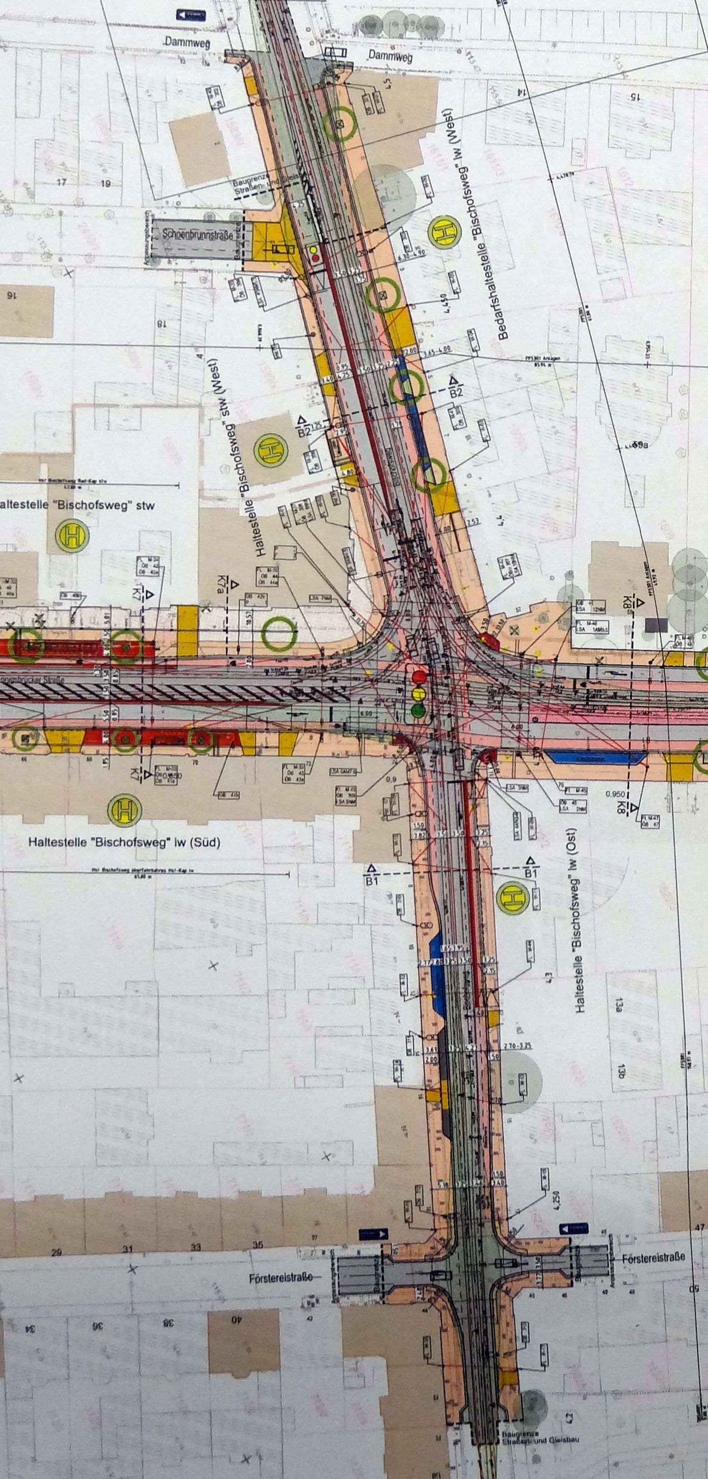 - Bischofsweg West, Südseite (Haltestelle 13 an der Schauburg): hier ist ab Dammweg ein Schutzstreifen mit Mindestmaß geplant und daneben eine untermaßige Hauptfahrbahn (1,25 m + 3 m). Das ist problematisch, besonders wenn der Verkehr bei Grün rollt. Es sollten alle Spielräume ausgeschöpft werden, hier noch etwas zu verbreitern – Ausgestaltung Schnittgerinne, Fußweg etwas schmaler etc. Optimal wäre hier eine Verschiebung der Gleise um etwa einen Meter nach Norden und der Entfall der Taxistellplätze auf der gegenüberliegenden Seite, damit mehr Platz auf der Südseite zur Verfügung steht. Das erscheint aber im derzeitigen Planungsstand nicht mehr durchsetzbar.