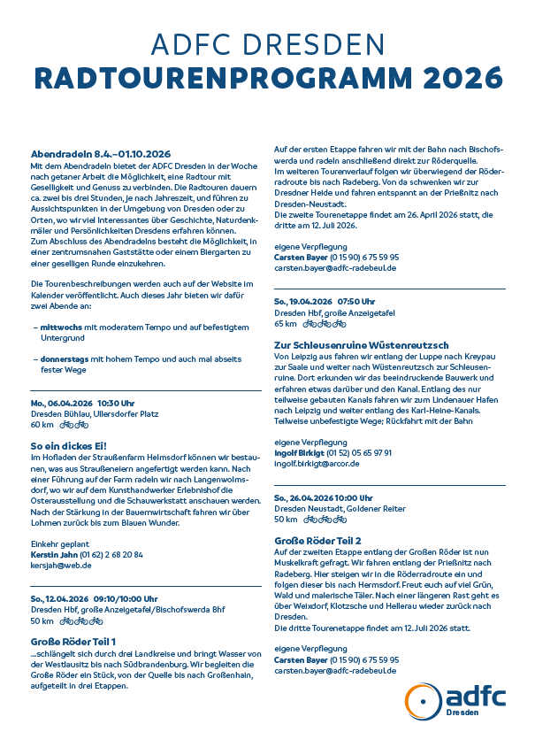 Das komplette Radtourenprogramm ist ab sofort online als PDF verfügbar. Zusätzlich sind alle Touren mit den wichtigsten Informationen im ADFC-Terminkalender hinterlegt. Mach mit und entdecke Dresden und seine Umgebung auf dem Fahrrad – wir freuen uns auf Dich!